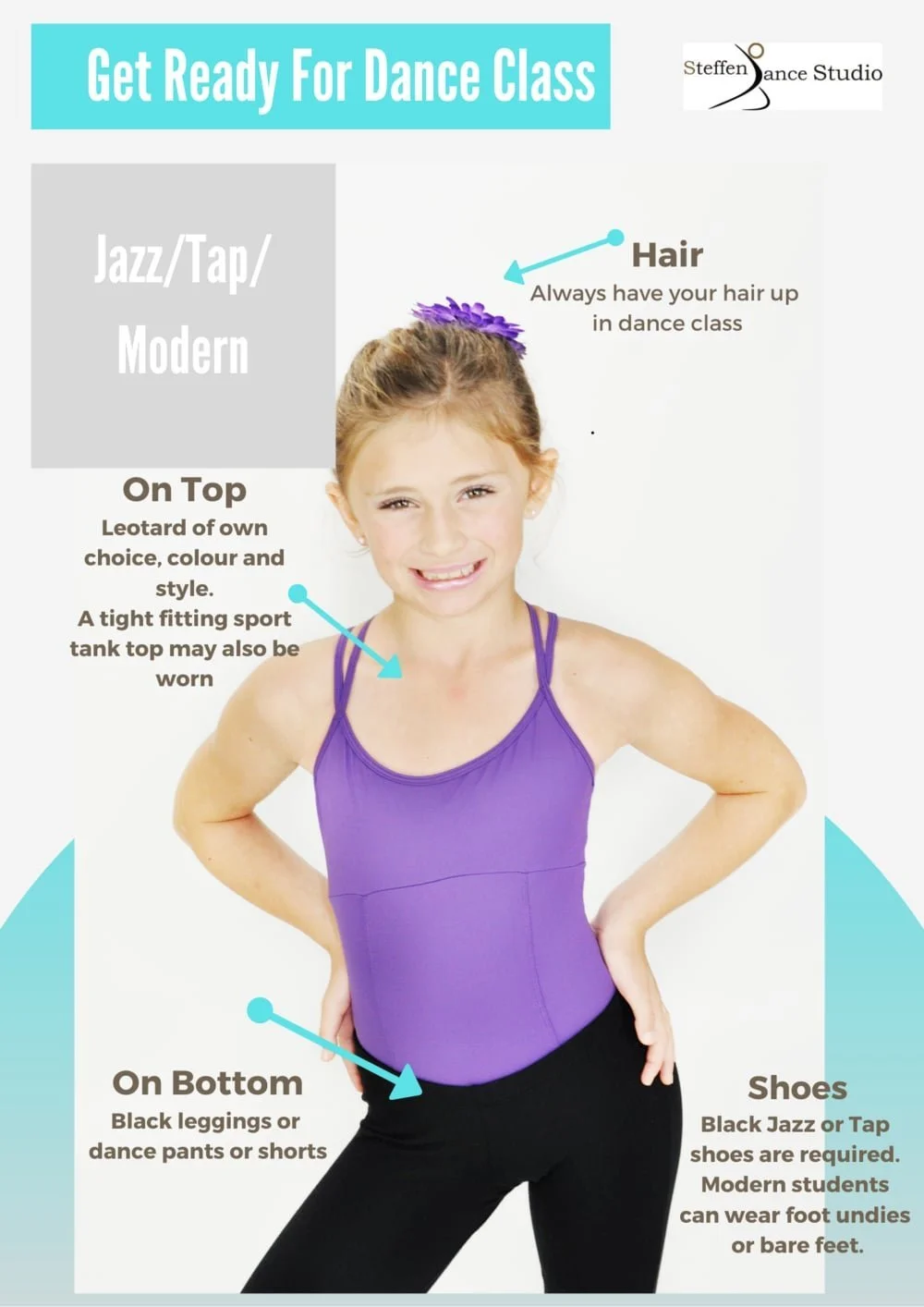 Female students in Programs 1, 2, 3, 4 and 5 should wear a BLACK bodysuit and suitable tights (Pink for ballet) along with shorts, leggings, warm ups etc.