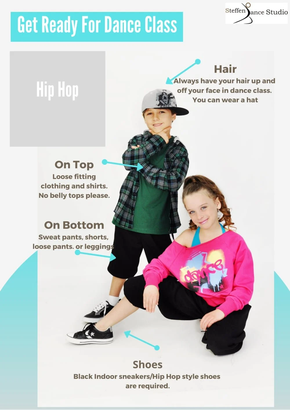 Dancers should wear loose fitting clothing for hip hop but can wear colours and patterns.